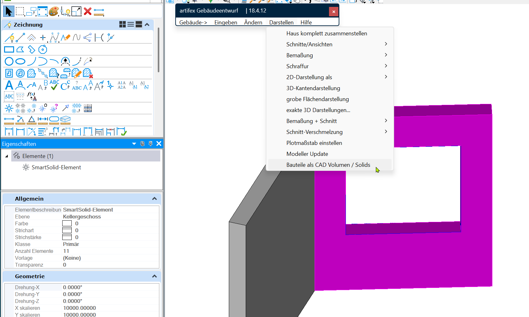 Ab Microstation Connect, AutoCAD 2026 und BricsCAD 2026 können die Bauteile des Gebäudeentwurfs als native CAD Solids dargestellt werde.