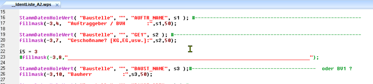 StammDatenHoleWert( „Baustelle“, „“, „AUFTR_STR“, s1 ); writeln(s1);